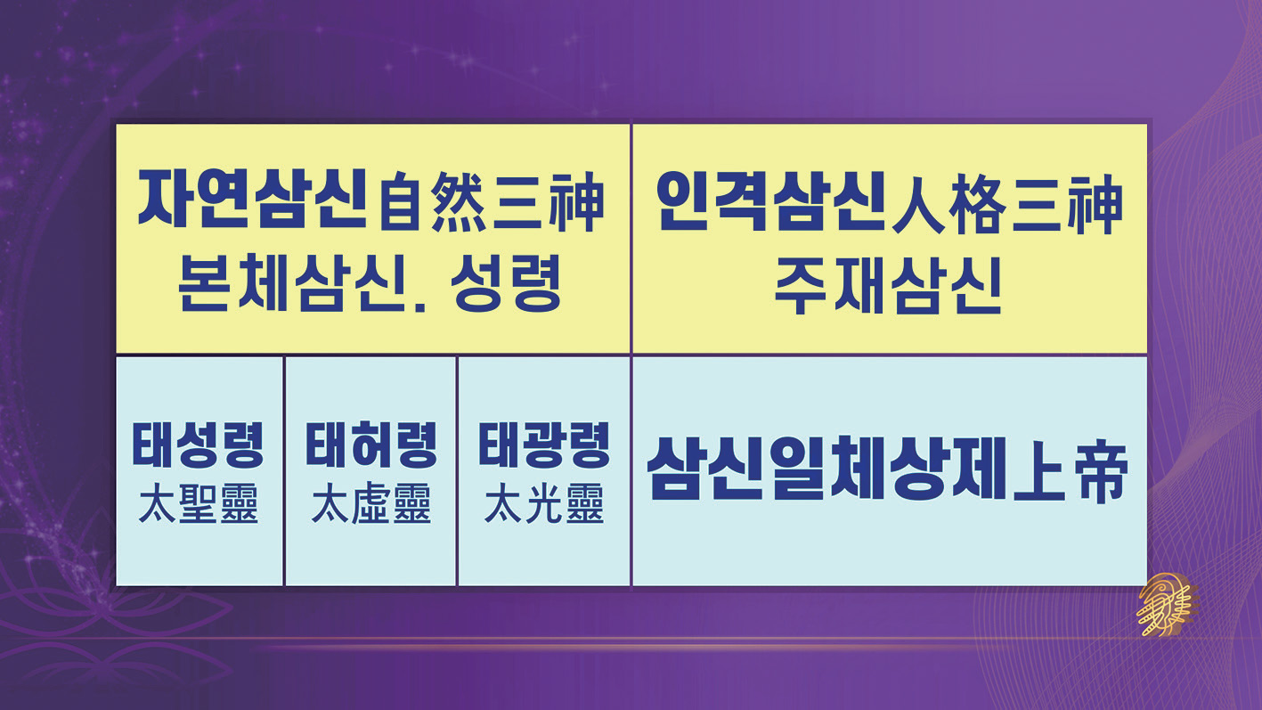 우주의 본체 삼신, 자연 삼신, 무형 삼신이신 태허령님이십니다. 우리 조상님들은 이 삼신과 한 몸으로 현실 시간 공간과 우주 세계를 다스리시는 아버지를 모셨습니다. 그 아버지는 환국, 배달, 조선 이후 1만 년 동안 전해진 천제 문화의 주인공이십니다. 그 아버지를, 나라를 창건한 분들과 함께 모셨습니다. 이 우주의 아버지와 어머니를 모시고 국조國祖를 모신 것입니다. 그리고 집에서는 조상님도 모셨어요. 우리 한국인은 조상이 자신의 절대 근본임을 잘 알고 모신 것입니다. 이것이 바로 한국인의 신관神觀입니다.