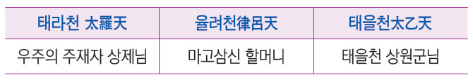 우주에 신선의 3대 하늘이 있습니다. 우주 아버지가 계신 태라천太羅天이 있고, 그다음에 마고삼신 할머니가 계신 율려천律呂天이 있습니다. 율려천에 계신, 조화신선과 도통 문화의 근원이신 마고삼신 할머니는 조화 신성 꽃을 내려주십니다. 그다음에 삼신 조물주의 빛의 율려 기운을 그대로 퍼 오는 태을천太乙天이 있습니다. 그리고 크게 보면 이 우주에는 팔천八天이 있는데, 이 삼천三天과 팔천이 확장돼서, ‘삼팔 이십사’ 해서 이십사천二十四天이 있어요.