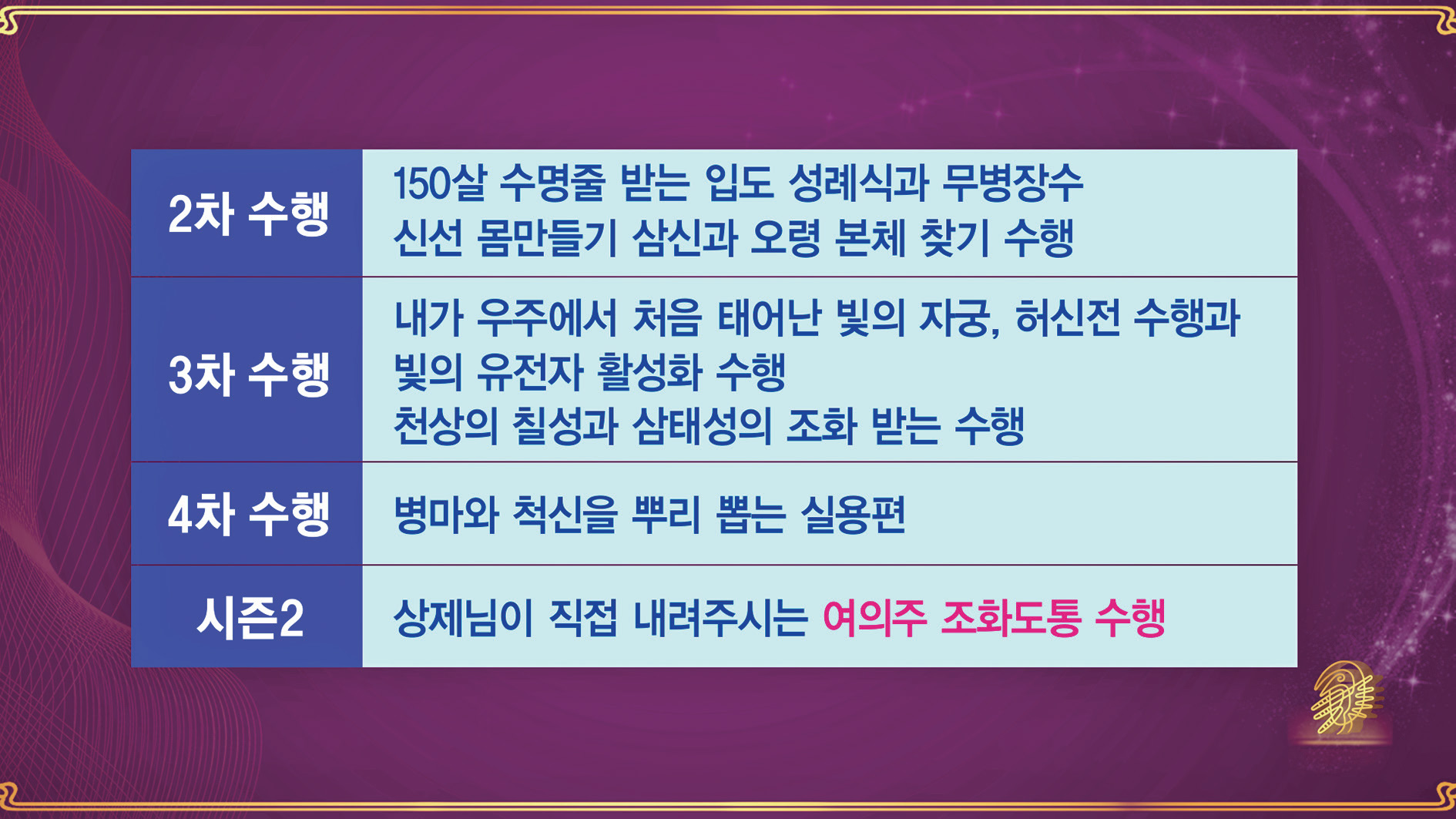 이 도통 수행법의 1차 수행 과정에는 방금 실행한 빛판, 빛 막대기를 활용하는 수행과 이제 받아 내릴 천상의 조화 꽃을 가지고 하는 수행이 포함됩니다.