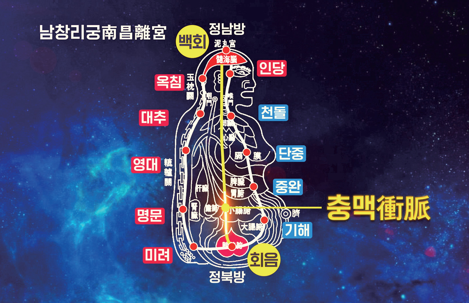 몸의 중심맥인 충맥衝脈은 백회에서 회음까지 수직으로 뚫려 있는데요. 위에 있는 백회百會는 남방이고 모든 양의 기운이 여기에서 만납니다. 제일 아래에 있는 회음會陰은 북방이고 본체 자리에 해당합니다. 내 몸의 막힌 도로망을 뚫는 것은 수행의 근본 출발점입니다.