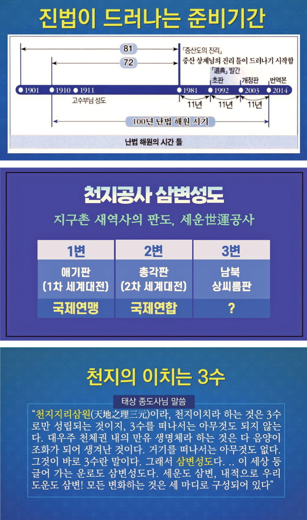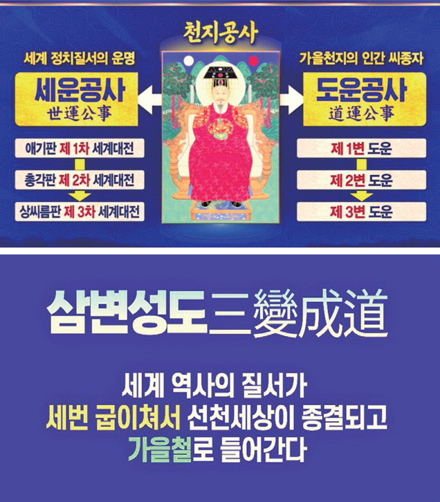상제님께서 보신 세운 공사에 따라 19세기 서양으로 기울어졌던 지구촌 힘의 질서가 이후 100여 년의 시간 동안 크게 세 번 굽이치면서 동서 간의 균형을 이루고, 상제님께서 강세하신 개벽의 땅, 한반도의 대한민국을 중심으로 후천 상생의 새 세상이 열리게 되는 대변혁의 노정이 펼쳐진다. 이는 천상 조화정부가 인간 역사 속에 자리 잡혀 가는 과정이기도 하다.