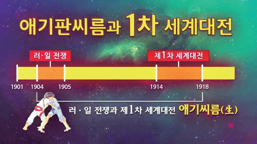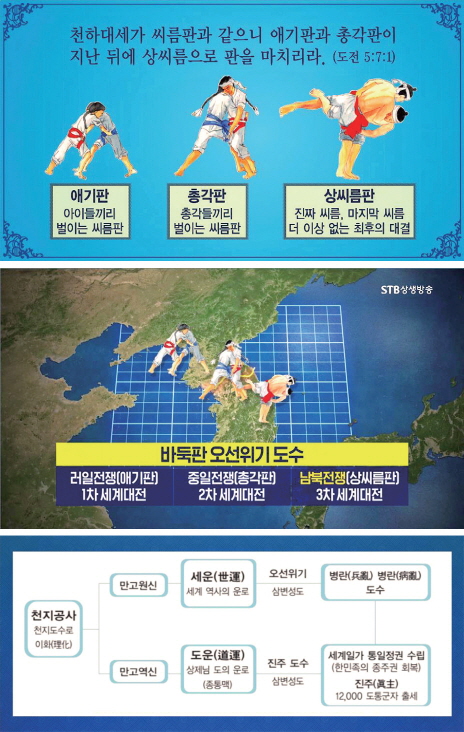 뒤에서 자세히 살펴보겠지만, 세운 공사의 애기판 씨름은 러일전쟁과 제1차 세계대전으로 전개되었고, 총각판 씨름은 중일전쟁과 제2차 세계대전으로 펼쳐졌다. 그리고 상씨름은 남쪽 상투쟁이와 북쪽 상투쟁이가 38도선을 경계로 하여 힘을 겨루는 한국전쟁과 앞으로 펼쳐질 제3차 세계대전으로 전개된다.