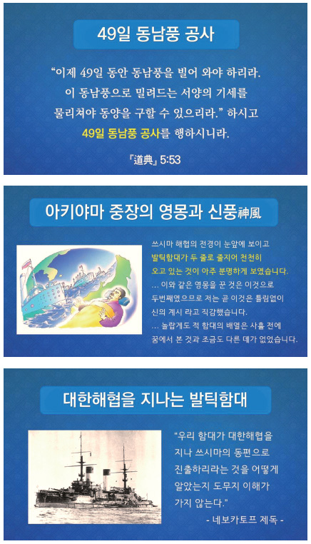 일본인들은 대한해협 해전에서 천우신조로 불어온 동남풍(도전道典 5:53, 상제님께서 보신 ‘49일 동남풍 공사’)을 ‘가미가제神風’라 불렀다. 당시 연합 함대 사령관 도고 헤이하치로東鄉平八郎 제독의 참모로 참여한 아끼야마秋山 중장(당시 중좌, 중령급)은 발틱 함대가 대한해협을 항진하는 장면을 영몽靈夢으로 두 번이나 자세히 계시받음으로써 전쟁을 승리로 이끌 수 있었다고 고백하였다(아사노 키즈지로淺野和三郞, 『동룡冬龍』).