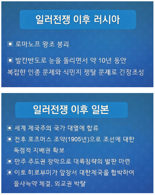 이 애기판에서 동양 제국주의 일본과 서양 제국주의 러시아가 한반도를 중심으로 판을 대하게 되었다. 본래 동양에 속했던 러시아는 표트르 대제 때 개혁을 통해 근대화를 가속하였다. 이후 러시아는 영토 확장과 함께 겨울철에 얼지 않는 부동항不凍港을 얻기 위해 남하를 시작하였고, 인도印度의 이권을 지키기 위해 이를 저지한 대영제국 간에 ‘그레이트 게임The Great Game’이 벌어졌다. 이 게임은 중앙아시아 내륙에서 충돌하다가 중국과 극동 지역으로 확대되었고, 러일전쟁에서 러시아가 패배하면서 막을 내렸다.
