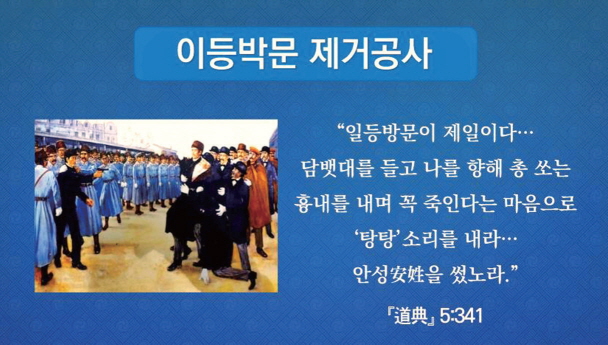 특히 ‘안安’씨 성姓에 붙인 이등박문 심판 공사는 매우 중요한 의미를 갖는다. 충혼 안중근安重根 의사는 동양 평화의 꿈을 향한 대한의 기개와 자주독립 의지를 만천하에 떨친 위대한 인물이다. 1909년 10월 16일 옛 조선의 도읍 하얼빈哈爾濱에서 조선 침략의 원흉 이토 히로부미(이등박문伊藤博文)를 심판한 이 사건은 동방 천자 문화의 종주인 조선의 식민지화를 주도하고, 동북아 역사의 종주권을 빼앗아 아시아의 패권을 움켜쥐고 지배하려는 검은 야심은 천지에서 용납할 수 없는 불의이기에 역사의 한 인물을 내어 그를 처단하신 것이다.