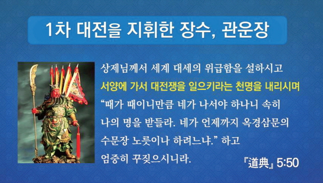 서양 제국주의 침략의 손길이 아프리카를 넘어 동아시아로 세력을 확장하면서 아편전쟁으로 청나라를 병들게 하고 이제 마지막 관문인 한반도를 향해 뻗쳐 왔을 때, 상제님께서는 일본 제국주의를 앞세워 서양 세력을 막게 하셨다. 그리고 약소민족을 지키기 위해 유럽에 대전쟁을 일으키는 공사를 보셨다. 이 대전쟁 공사를 신도에서 집행하는 주인공이 바로 천지 병마대권兵馬大權을 맡아 주재하는 관운장關雲長이었다. 상제님께서는 충의로 충만한 관운장에게 서양 제국주의의 불의와 오만을 청룡언월도靑龍偃月刀로 내리쳐 베게 하신 것이다. 이때 조선의 각 지방을 돌보고 지켜 주는 보호성신들도 상제님의 명을 받고 서양에 가서 크게 역사하였다.