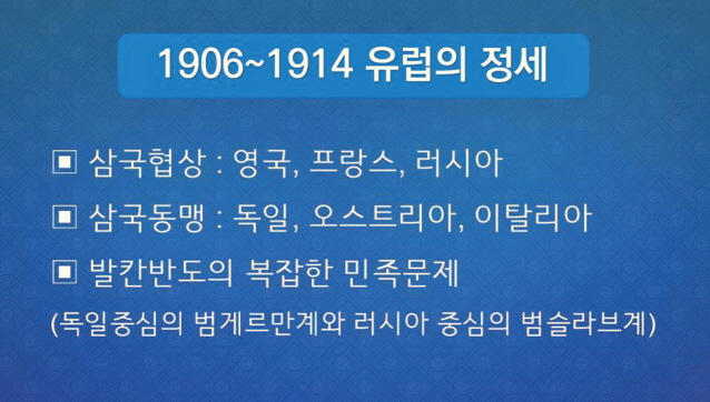 1906년부터 1914년까지 유럽에서는 영국⋅프랑스⋅러시아(삼국협상三國協商)와 독일⋅오스트리아⋅이탈리아(삼국동맹三國同盟)의 두 제국주의 집단이 충돌을 일으키며 긴장을 고조시켜 나갔다. 언제 터질지 모르는 긴장 속에서 유럽은 세계의 화약고라 불린 발칸반도에서 복잡하게 얽힌 민족 문제(독일 중심의 범게르만주의와 러시아 중심의 범슬라브주의와의 충돌)가 불거지면서 전쟁의 소용돌이에 휩쓸려 들어갔다.