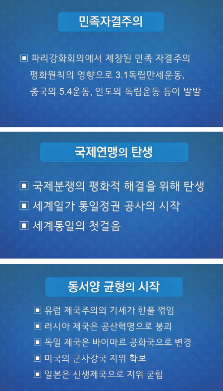 제1차 세계대전이 끝나고 유럽에서는 더 큰 전쟁이 준비되었다. 전후 파리 강화회의에서 베르사유 조약을 체결하면서, 독일에 엄청난 배상금을 물게 하고 전승국의 의도에 따라 복잡하고 새로운 국경선이 다시 그어지면서 민족 간 감정의 골이 더욱 깊어졌다. 이런 제국주의 열강의 꺼지지 않는 탐욕은 더 큰 전쟁을 불러오는 계기가 되었다.