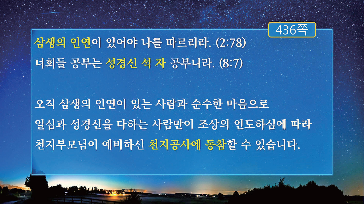 천지부모님과 함께하기 위해서는 전생⋅현생⋅내생, 삼생의 인연이 있어야 합니다. 그래서 상제님 진리 공부는 성경신誠敬信 석 자 공부라고 말씀을 하셨습니다. 오직 삼생의 인연이 있는 사람과 순수한 마음으로 일심一心, 성경신을 다하는 사람만이 천상의 조상님이 인도하심에 따라 천지부모님이 예비하신 천지공사에 함께 동참할 수 있습니다.
