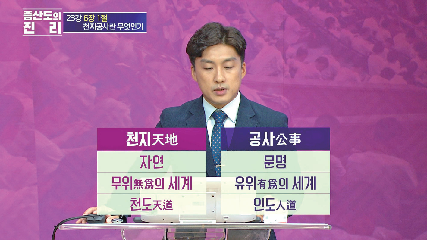 천지는 자연과 신도를 묶어서 하는 이야기이고, 공사라는 것은 문명의 세계, 인간의 역사를 이야기합니다. 천지는 자연, 무위無爲의 세계를 말하고, 문명은 유위有爲의 세계를 말합니다. 천지는 천도天道를 다루고, 공사는 인도人道에 대해 이야기하는 것입니다.