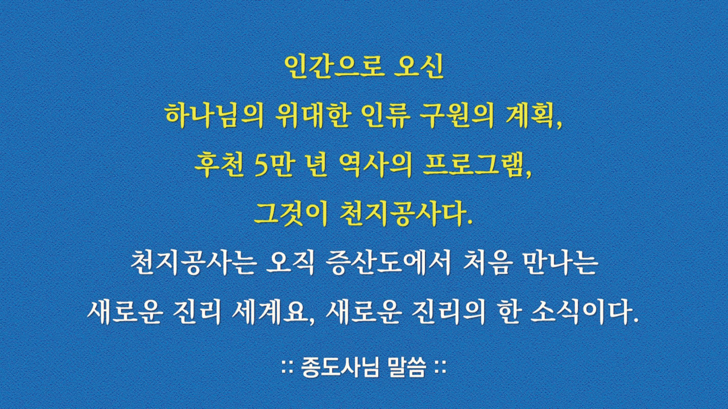 증산 상제님께서 천지인 삼계를 주재하시는 무상한 조화 권능으로 1901년부터 1909년까지 병든 천지를 뜯어고쳐서 새 세상을 여셨는데 천지공사를 알고 나면 이 역사가 한 치의 오차도 없이 그대로만 가고 있다는 것을, 감독의 시나리오대로 모든 것이 움직이고 있다는 걸 느낄 수 있습니다.