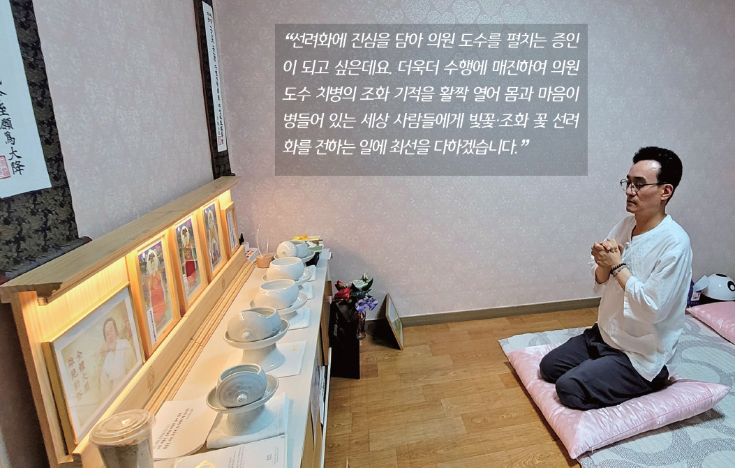 앞으로 선려화에 진심을 담아 의원 도수를 펼치는 증인이 되고 싶은데요. 더욱더 수행에 매진하여 의원 도수 치병의 조화 기적을 활짝 열어 몸과 마음이 병들어 있는 세상 사람들에게 빛꽃⋅조화 꽃 선려화를 전하는 일에 최선을 다하겠습니다. 아울러 구도의 길에서 멀어진 옛 동지들을 다시 모으는 일에 전력하여 제가 그랬듯이 그 동지들 또한 새 생명을 얻어 보은할 수 있는 기회를 얻을 수 있도록 더욱 정성을 다하겠습니다. 보은!