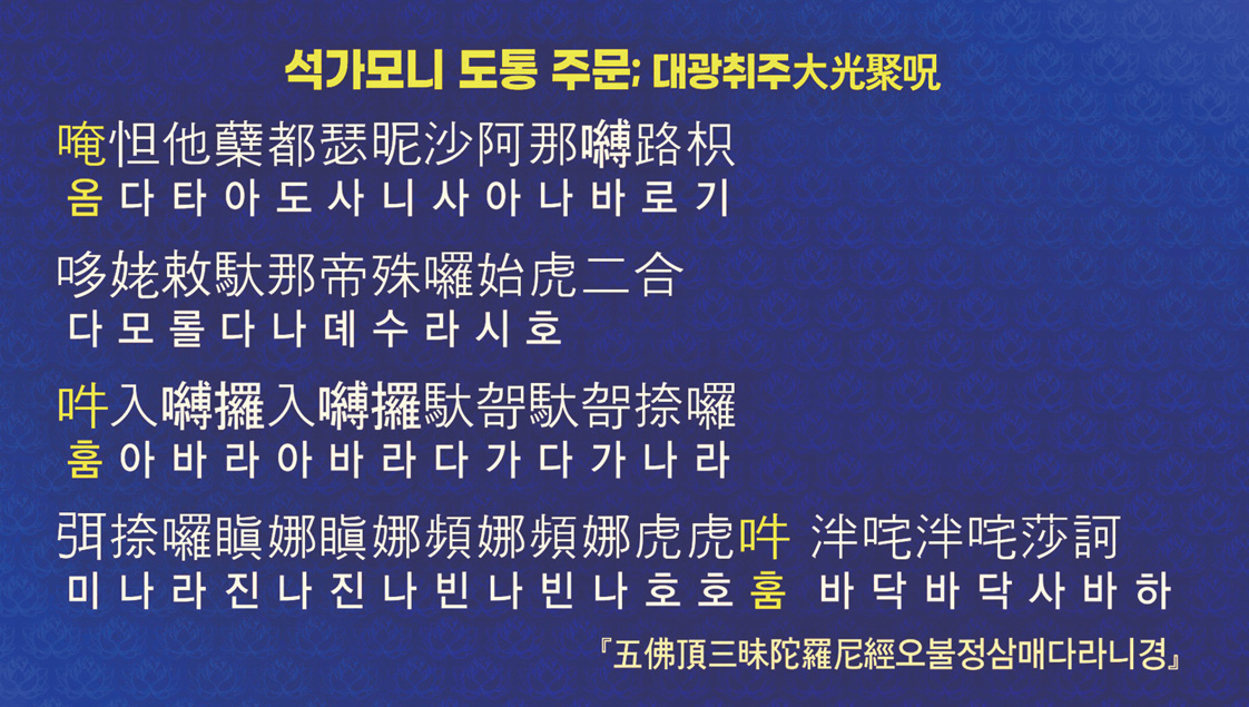 태을주는 2만 5천 년이 걸려서 완성되었습니다. 전라도 목포 위에 있는 함평咸平에 살던 구도자 김경소라는 분이 50년 동안 이 주문을 읽어서 마지막에 도통을 했어요. 그래서 이 주문이 전수된 것입니다. 훔치훔치吽哆吽哆 태을천太乙天 상원군上元君 훔리치야도래吽哩哆㖿都來 훔리함리사파하吽哩喊哩娑婆訶.