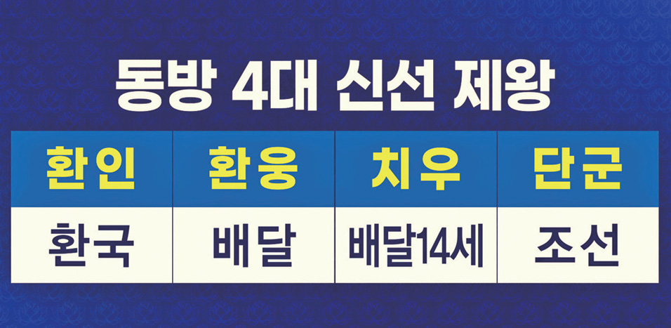 인류 문명사에서 최상의 네 분 신선은 누구일까요? 바로 환인, 환웅, 치우, 단군입니다. 안파견安巴堅 환인桓因은 환국의 시조이고, 거발환居發桓 환웅桓雄은 26세 때 배달국을 건국한 분입니다. 치우蚩尤라는 분은 배달국 14세 환웅인데, 중국 사람들이 가장 무서워하는 전쟁의 신입니다. 중국에서 그 이름을 왜곡해서, 벌레 충虫 자가 들어 있는 치蚩 자를 서서 ‘치우蚩尤’라 했습니다. 원래는 다스릴 치治 자, ‘치우治宇’예요. ‘치우’는 ‘나는 온 우주를 다스리는 자’라는 뜻을 가지고 있습니다. 이 빛의 세계, 신선 세계를 중국에 대중화시킨 분이 치우천황입니다. 그다음에 조선의 시조 단군檀君이 계셨습니다.