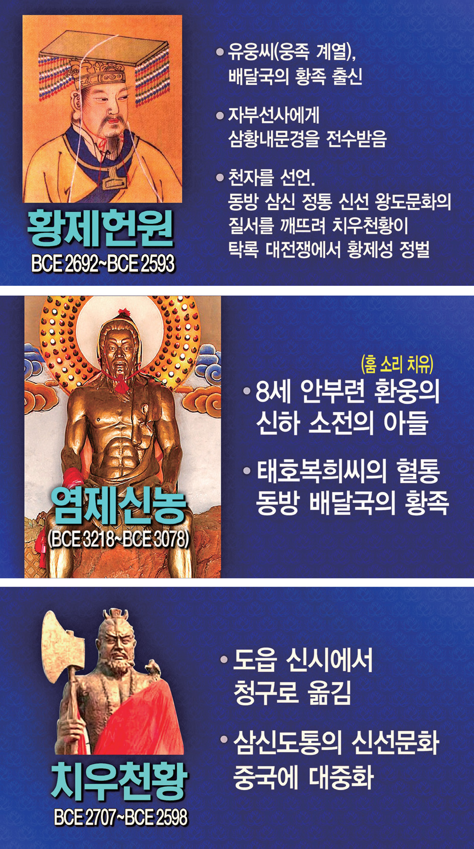 중국 문화의 뿌리는 환국, 배달의 신선 제왕들과 황족이었습니다. 우리가 잘 알고 있는 태호복희씨太皞伏羲氏, 염제신농씨炎帝神農氏가 그런 분입니다. 중국에서는 4,700년 전 치우천황과 같은 때 인물인 황제헌원黃帝軒轅을 중국 한족漢族의 시조라 합니다. 그런데 황제헌원은 한족이 아니라 환국 때 인물인 소전씨少典氏의 후예입니다. 소전씨는 염제신농의 아버지입니다.