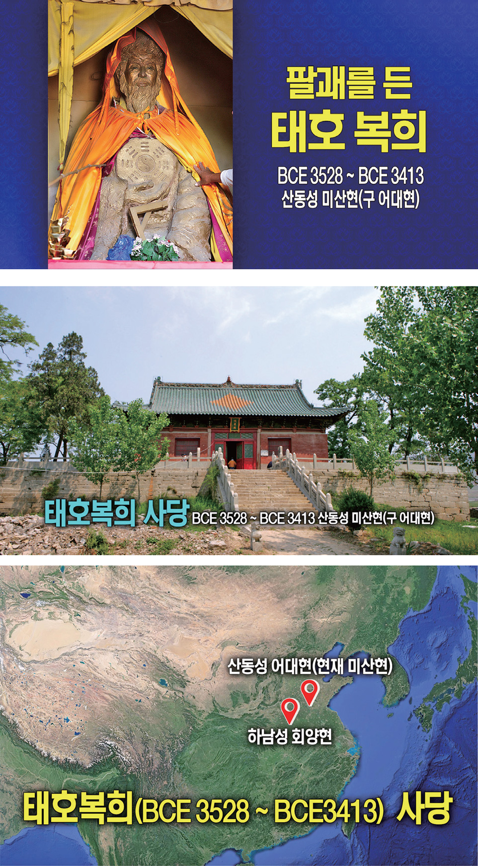 산동성山東省 어대현魚臺縣에 태호복희씨의 상像이 있습니다. 그 상이 태호복희씨의 실제 모습과 비슷합니다. 그 상의 용안은 아주 실감이 납니다. 이분이 돌아가신 곳은 봉황산입니다. 복희씨가 “내가 거기서 죽었다. 내가 죽으려고 거기에 들어갔다.” 그러셨거든요.