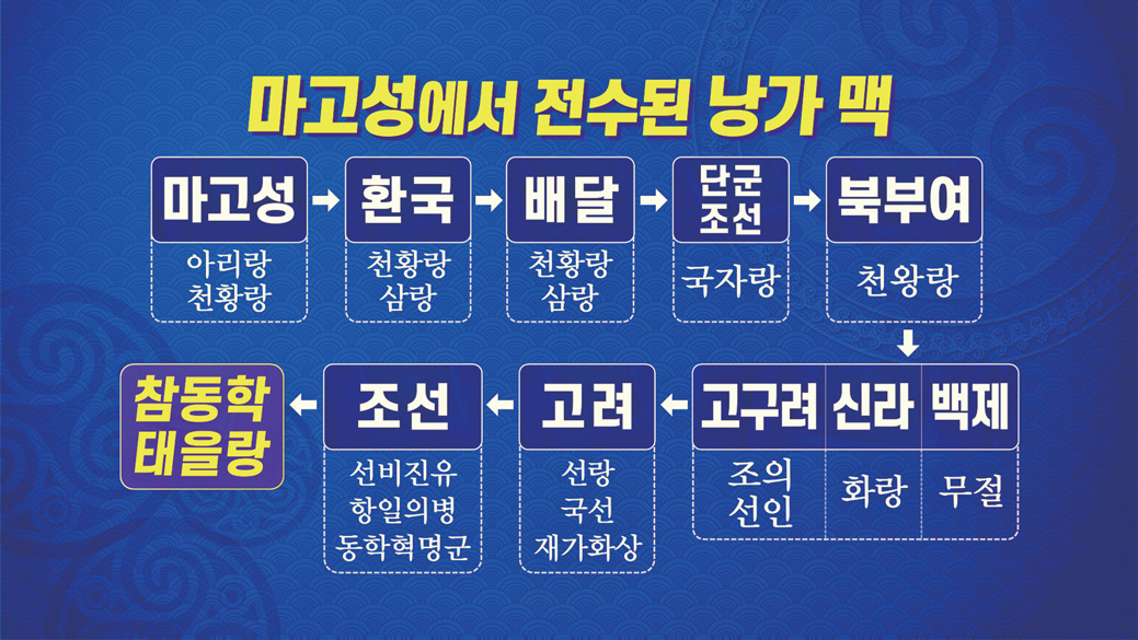 조화신선 대도통 문화는 동학에서 선언되고 증산도에서 완성됩니다. 이 문화는 환국, 배달, 조선으로 내려왔습니다. 우리의 국통맥과 함께 조화신선 도통맥道統脈이 있습니다. 그런데 그 이전에 마고삼신麻姑三神 할머니가 계셨습니다. 마고성 율국律國에서 아리랑 문화가 유래했는데, 아리랑은 신선 문화의 종주가 되는 혈통을 뜻합니다.