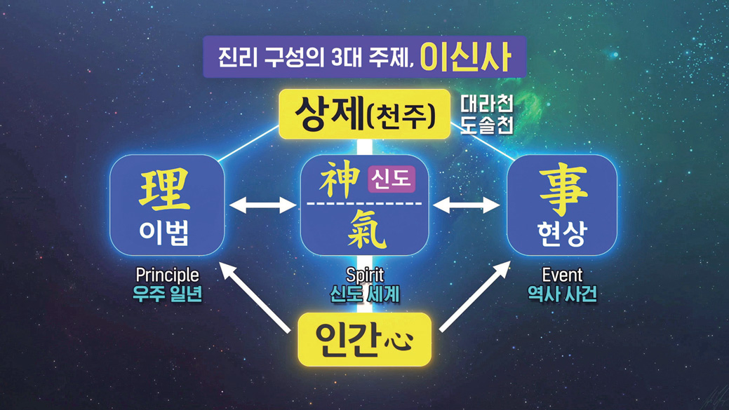 먼저 우주 원리, 이법理法을 알아야 합니다. 우주의 이치를 깨닫는 공부인 우주관宇宙觀의 핵심은 ‘우주 1년 이야기’에 들어 있습니다. 이 우주에는 1년 사계절, 인간 농사를 짓는 순환 원리가 있습니다. 그런데 우주 이법에 도통해도, 자연과학을 도통해도 신神의 세계를 알지 못한다면 그것은 반쪽 도통입니다. 우주의 이법을 다스리는 신神의 세계가 있기 때문입니다. 망량계와 신명계, 다른 말로 본체계와 인격신 세계가 있는 것입니다.
