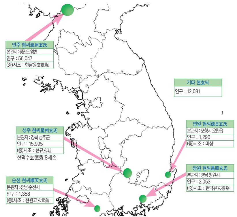 현玄씨의 시조는 시랑공侍郎公 현담윤玄覃胤이다. 고려 의종毅宗조에 장군이 되었고, 명종明宗 때는 조위총趙位寵의 난을 진압한 공으로 문하시랑평장사門下侍郞平章事에 올랐으며 연산군延山君에 봉해졌다. 연주延州와 연산延山은 평안도 영변寧邊의 옛 이름이다. 따라서 후손들이 연주를 관향으로 삼게 되었다. 그런데 우리나라의 현씨는 대개가 연주 현씨 시조 현담윤의 후손들이라고 한다.