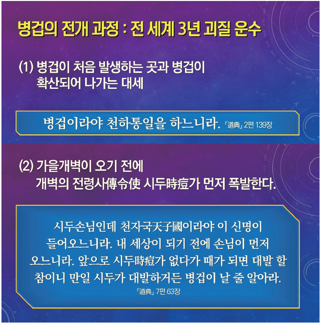 병겁은 선천 5만 년 역사를 마무리 짓는 대개벽기에 모든 인류의 생사를 판가름하는 대변혁의 과정