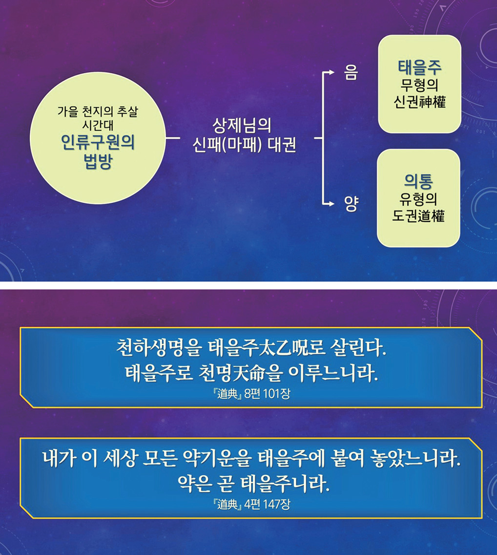 우주의 숙살기운으로 정리되는 인간개벽에서 생명을 구하는 유일한 도구는 천지와 더불어 영원히 하나 되어 살 수 있게 하는 태을주와 의통뿐이다.