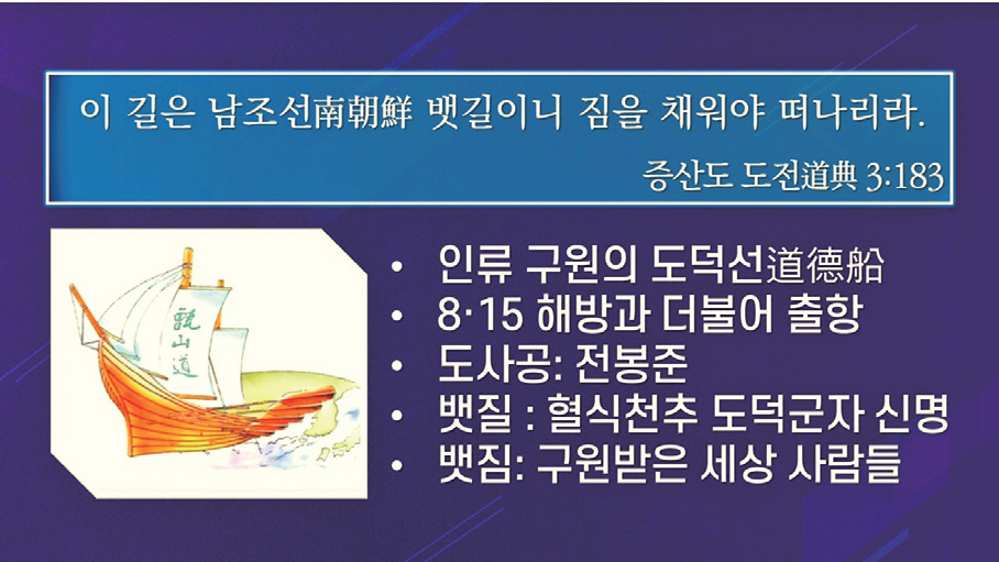 남조선은 문자적으로는 ‘남쪽 조선’ 즉 분단된 과도기 체제의 남쪽 조선으로, 하느님이 인간 세상에 자리 잡으시는 중심 땅을 가리키는 말이다. 상제님께서는 남조선이 주체가 되어 행할 인류 구원의 과업을 남조선 배 도수로 정해 놓으셨다. 이 남조선 배는 인류 구원의 도덕선道德船으로 천추만대에 길이 빛날 도덕군자의 성신들이 인류 구원 사명을 안고 이 배에 타고 있다. 동학혁명을 일으킨 전명숙 대장군이 도사공, 즉 선장으로 있는