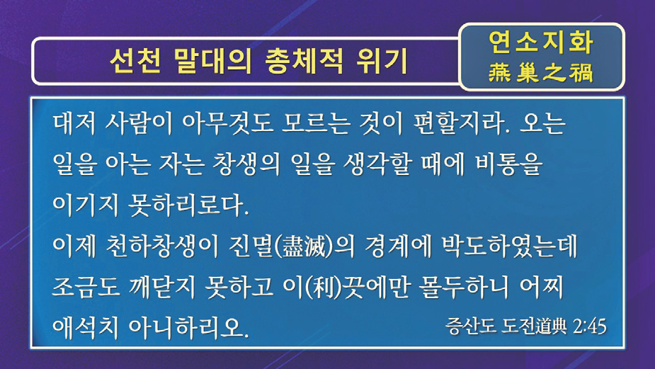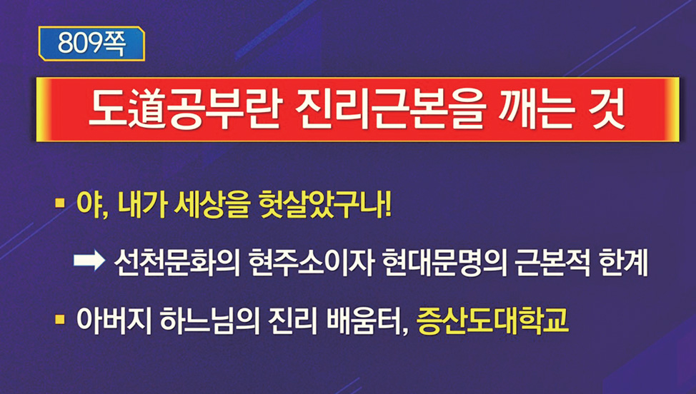 판밖 소식인 증산도를 만나 상제님 진리 대의를 크게 깨치고 충격을 받을 때, “야, 내가 세상을 헛살았구나!” 하고 자탄하며 각성하게 된다. 선천 세상의 어떤 가르침도 가을 우주의 개벽 세계가 있다는 것을 전혀 모르고 있다. 이것이 선천 문화의 현주소이자 오늘날 현대 문명의 근본적 한계이다.