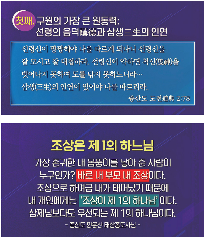 내 생명의 직접적인 뿌리요, 나를 있게 한 조물주는 바로 부모, 조상이다. 모든 생명은 뿌리 기운을 받아 태어나고 자라며 살아간다. 수천 년을 쌓아 온 조상의 음덕에 힘입어 그 자손이 상제님을 제대로 신앙하게 된다. 아울러 전생과 이생의 인연으로 상제님 진리를 만나고, 그 만남에 의해 다음 생까지 결정이 된다. 그런데 현실적으로 중요한 것은 바로 지금, 이 순간이다. 오늘 이 순간, ‘하느님 아버지가 이 땅에 오셨구나, 나는 오직 상제님 진리를 위해 살 것이다.’라고 확신하고 광제창생을 위해 뛰어들어야 한다. 인간은 누구나 상제님 진리를 만나기 위해서 살아가고 있다.