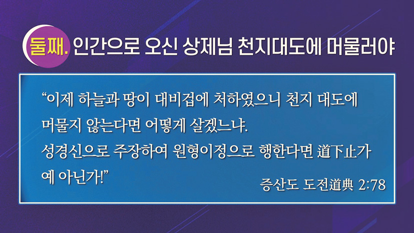 인간으로 오신 상제님의 천지 대도에 머물러야 한다.