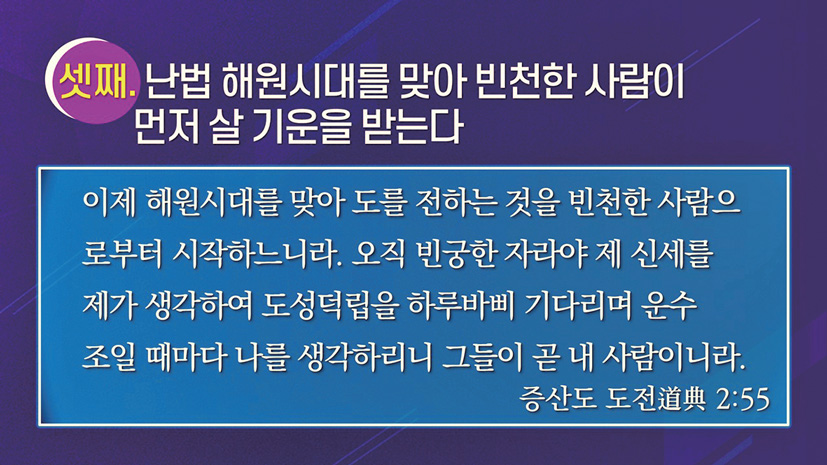 난법 해원 시대를 맞아 빈천한 사람이 먼저 살 기운을 받는다고 하셨다.