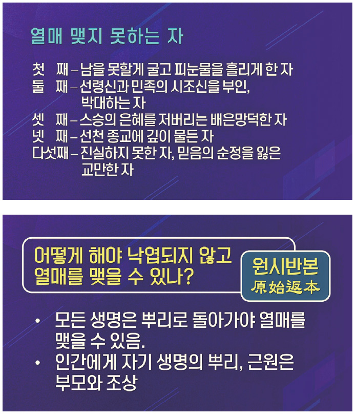 가을은 만물이 결실하는 때로 모든 생명은 뿌리로 돌아가야 열매를 맺을 수 있다. 인간에게 자기 생명의 뿌리, 근원은 부모와 조상이다. 자손이 아무리 못났다 하더라도 이번 개벽철에 자손이 한 명이라도 살아남으면 그 조상이 다 구원받아 후천으로 넘어갈 수 있다.