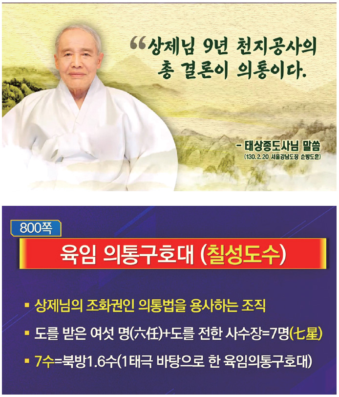 고 하셨다. 개벽 실제 상황에서는 여섯 명이 있어야 의통을 집행해서 사람을 살려 낼 수 있기 때문이다. 각기 다른 임무를 맡은 여섯 명과 그들 조직의 수장 한 명이 칠성 도수에 따라 육임 의통구호대가 되어 천하 창생을 의통인패의 조화로 살려 내게 된다.