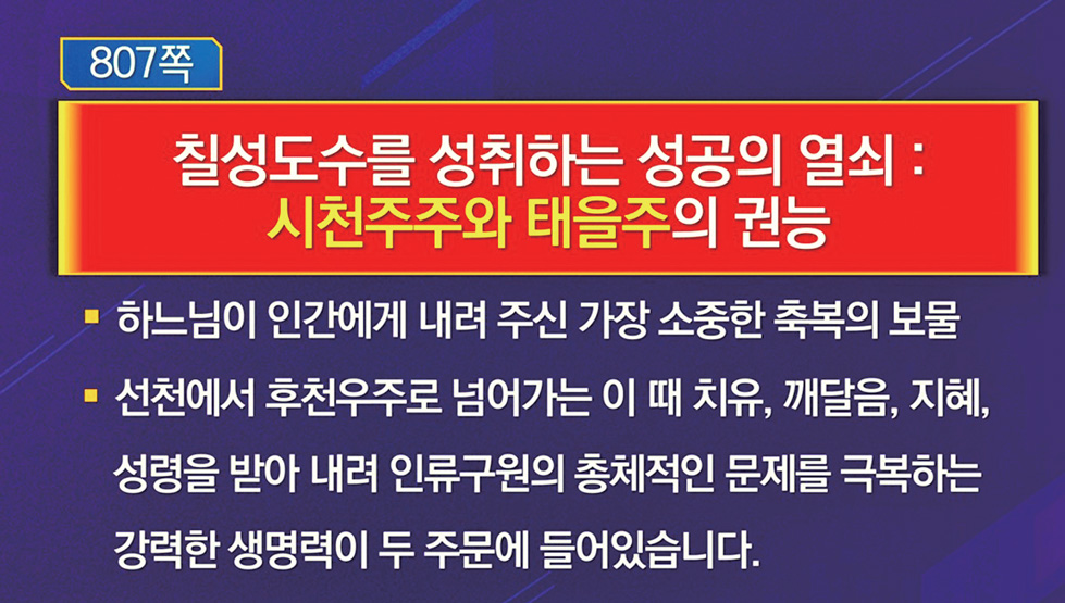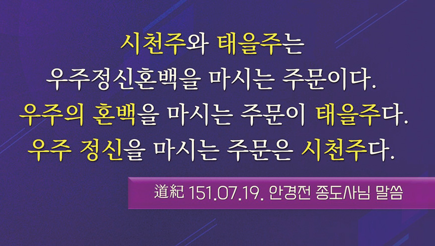 을 말씀하셨다. 태을주는 의통의 근원으로 하느님이 인간에게 내려 주신 가장 소중한 축복의 보물이다. 항상 태을주를 입에 물고 다니면 천지의 조화 성령을 받음으로써 사람을 보는 눈이 열리고 진리를 듣는 밝은 귀가 열리며, 일꾼의 심법이 열리고 자신감이 생겨 모든 장애를 극복하여 칠성 도수 포교를 성사시키게 된다.