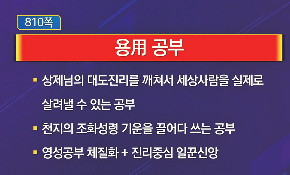 용用 공부란 상제님의 대도 진리를 깨쳐서 세상 사람을 실제로 살려 낼 수 있는 공부로서, 진리의 주인공이 되어 천지의 조화 성령 기운을 끌어다 쓰는 공부다. 세상 사람을 상제님의 대도 세계로 인도하는 성패의 관건은 어떻게 정신이 깨어날 수 있게 생명력 있는 말로써 진리를 전하느냐 하는 것인데, 상제님께선 이를 ‘