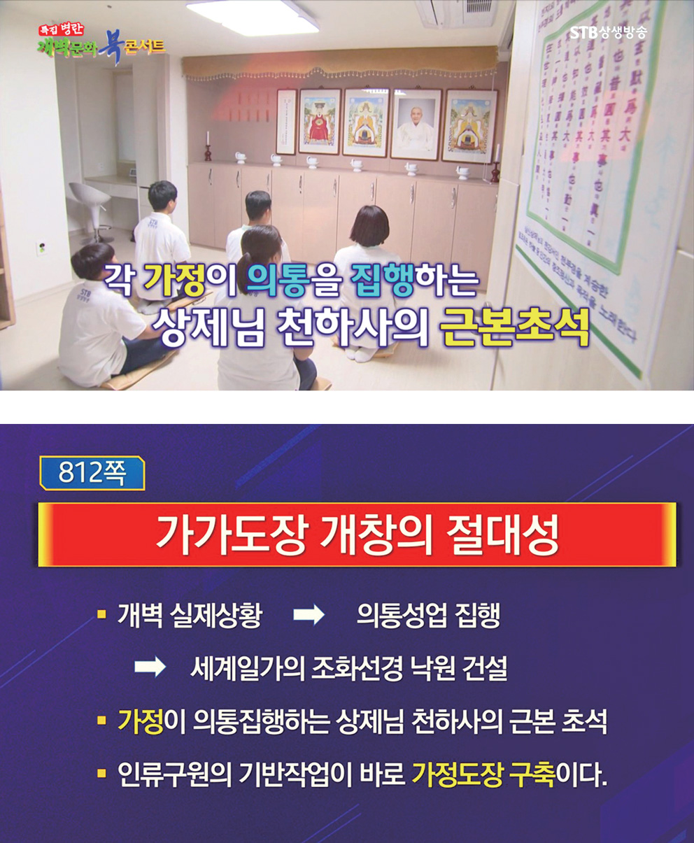천지 일꾼들의 각 가정이 의통을 집행하는 상제님 천하사의 근본 초석이 된다. 후천 5만 년 세계일가 통일 문명의 출발점, 가을 하늘의 조화선경 건설의 구심점이 바로 가정 도장이다.