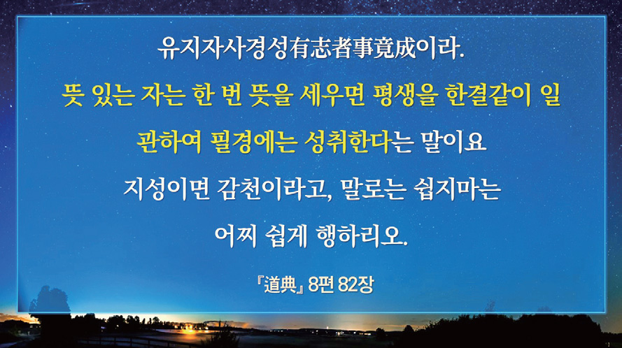 지금은 상제님 도를 받은 모든 일꾼이 인류 구원의 대사명을 깊이 깨쳐서, 진리의 음성과 숨결로 충만한 도군道軍이 되어 천하 창생을 위해 희생 봉사하는 삶을 실천해야 할 때이다.
