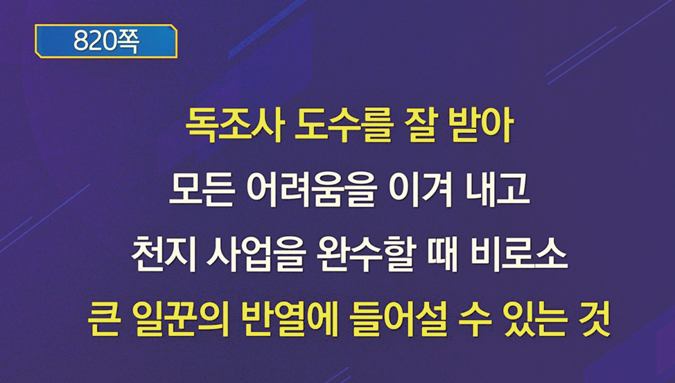 새 역사의 참주인이 되는 일꾼은 자신의 모든 역량과 재화를 아낌없이 다 바쳐서 쓰도록 상제님께서 천명으로 정해 놓으셨다. 독조사 도수를 잘 받아 모든 어려움을 이겨 내고 천지 사업을 완수할 때 비로소 큰 일꾼의 반열에 들어설 수 있다.