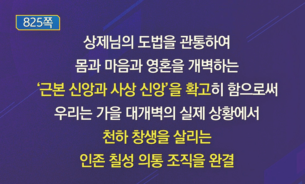 상제님 도법을 관통하여 몸과 마음과 영혼을 개벽하는 ‘근본 신앙과 사상 신앙’을 확고히 함으로써, 우리는 가을 대개벽의 실제 상황에서 천하 창생을 살리는 인존 의통 조직을 완결할 수 있다. 그래서 상제님과 태모님께 지극한 정성으로 청수淸水 올리고 배례를 드리며 기도와 수행을 생활 속에서 꾸준히 실천하는 것이 너무도 중요하다.