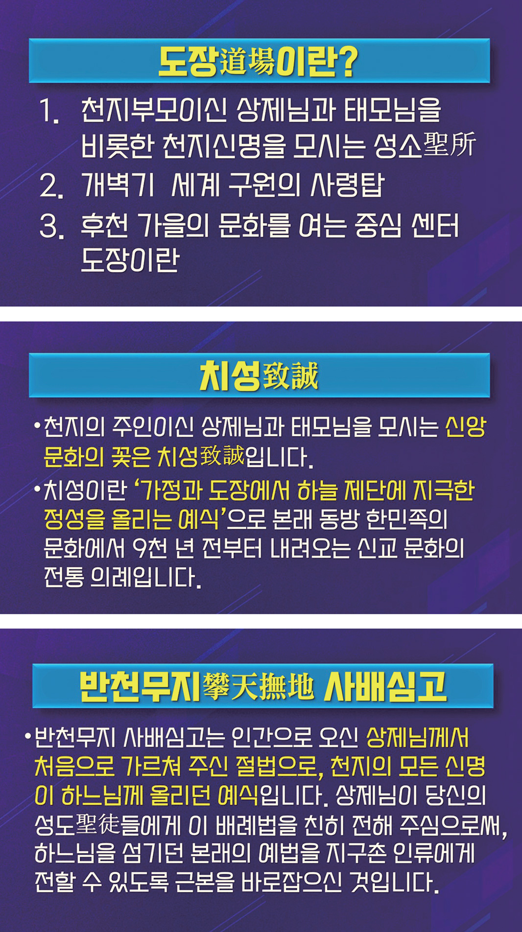 의례를 모신다. 치성은 천단에 지극한 정성을 올리는 예식이다. 이때는 하늘을 받들고 땅을 어루만지는 반천무지攀天撫地 사배심고四拜心告