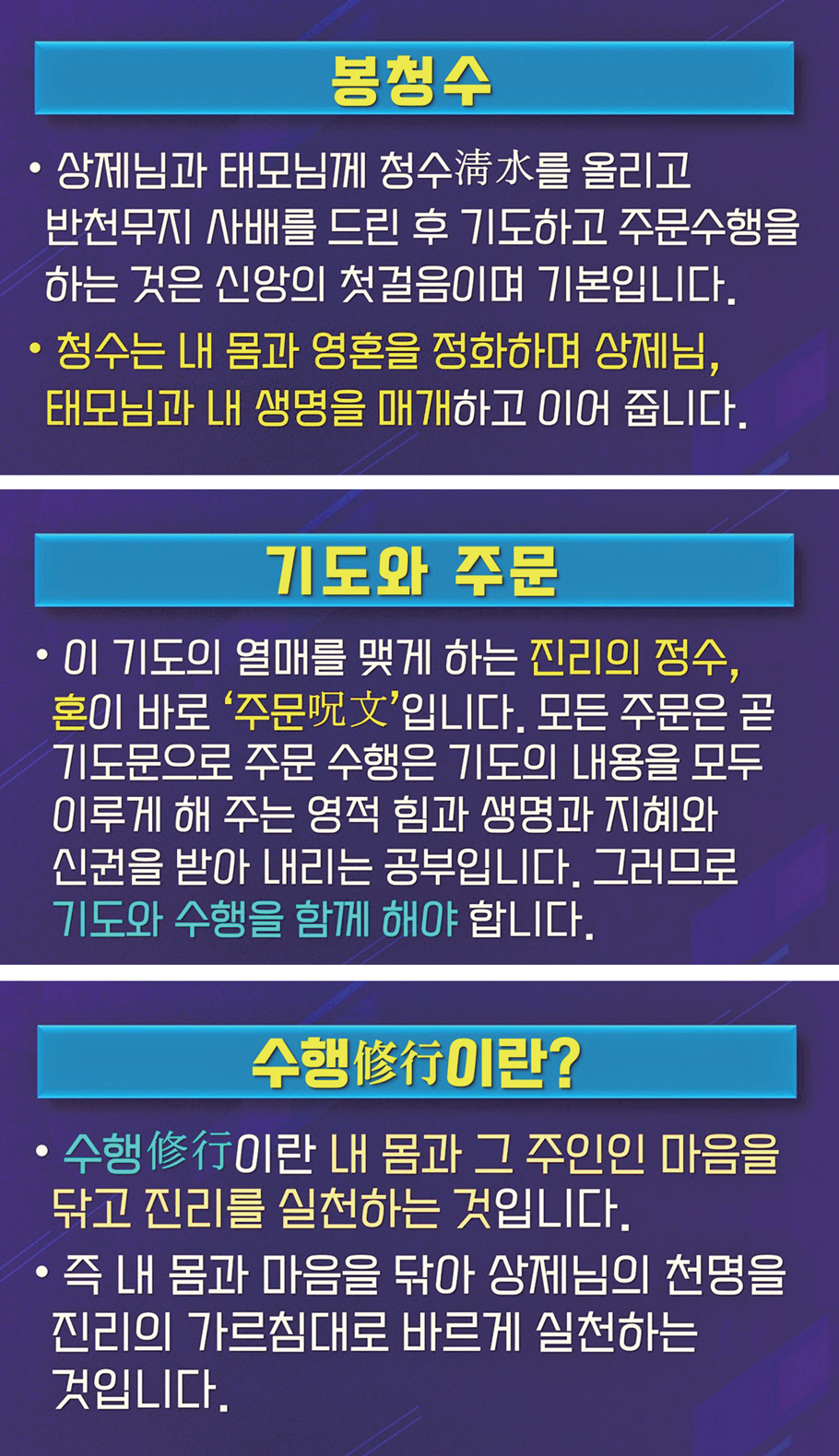 청수를 올리고 반천무지 사배를 드린 후 기도하고 주문 수행을 하는 것은 신앙의 첫걸음이며 기본