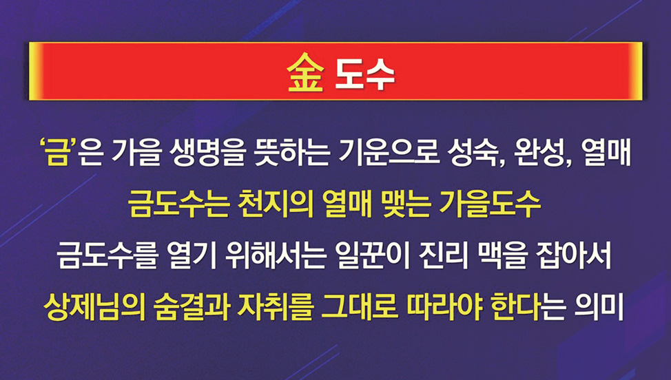가을개벽으로 들어서는 동북아 역사 대전쟁 상씨름 대운의 끝마무리에서 인류 역사가 실로 위대한 도약을 하게 된다. 이것이 상제님께서 장암에서 보신 가을 ‘금金 도수’이다. ‘금金’은 가을의 생명을 뜻하는 기운으로 성숙, 완성, 열매를 상징한다.
