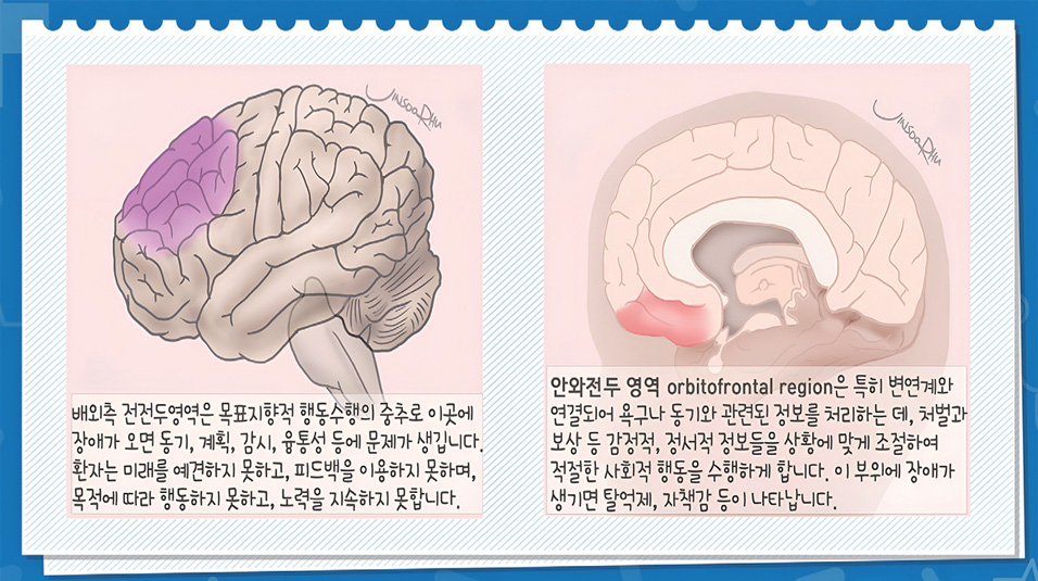 전두엽은 뇌 중의 뇌로서, 사고와 판단 등 고도의 정신 작용을 합니다. 정보를 종합해 계획을 세우고 집중해서 추진하게 하죠. 난관에 부딪혔을 때 플랜 B를 구상하는 등 사고의 유연성도 전두엽의 역할입니다.