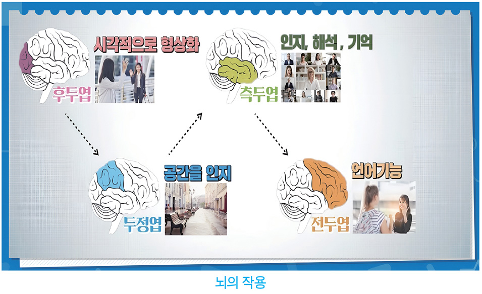 융통성이 없다면 전두엽, 기억력이 없다면 측두엽, 길치라면 두정엽, 앞을 못 본다면 후두엽이 문제인데요. 대뇌의 각 부위는 서로 긴밀하게 연결되어 있습니다. 지인을 거리에서 만났을 때, 후두엽이 그 사람을 시각적으로 형상화해요. 시각적 이미지를 접수한 두정엽은 그 사람을 만난 공간을 인지합니다. 두정엽의 공간 이미지를 바탕으로 측두엽은 그 사람과의 과거 기억을 끄집어내죠. 그리고 이런 내용을 바탕으로 전두엽이 언어 기능을 발휘해 인사를 합니다.