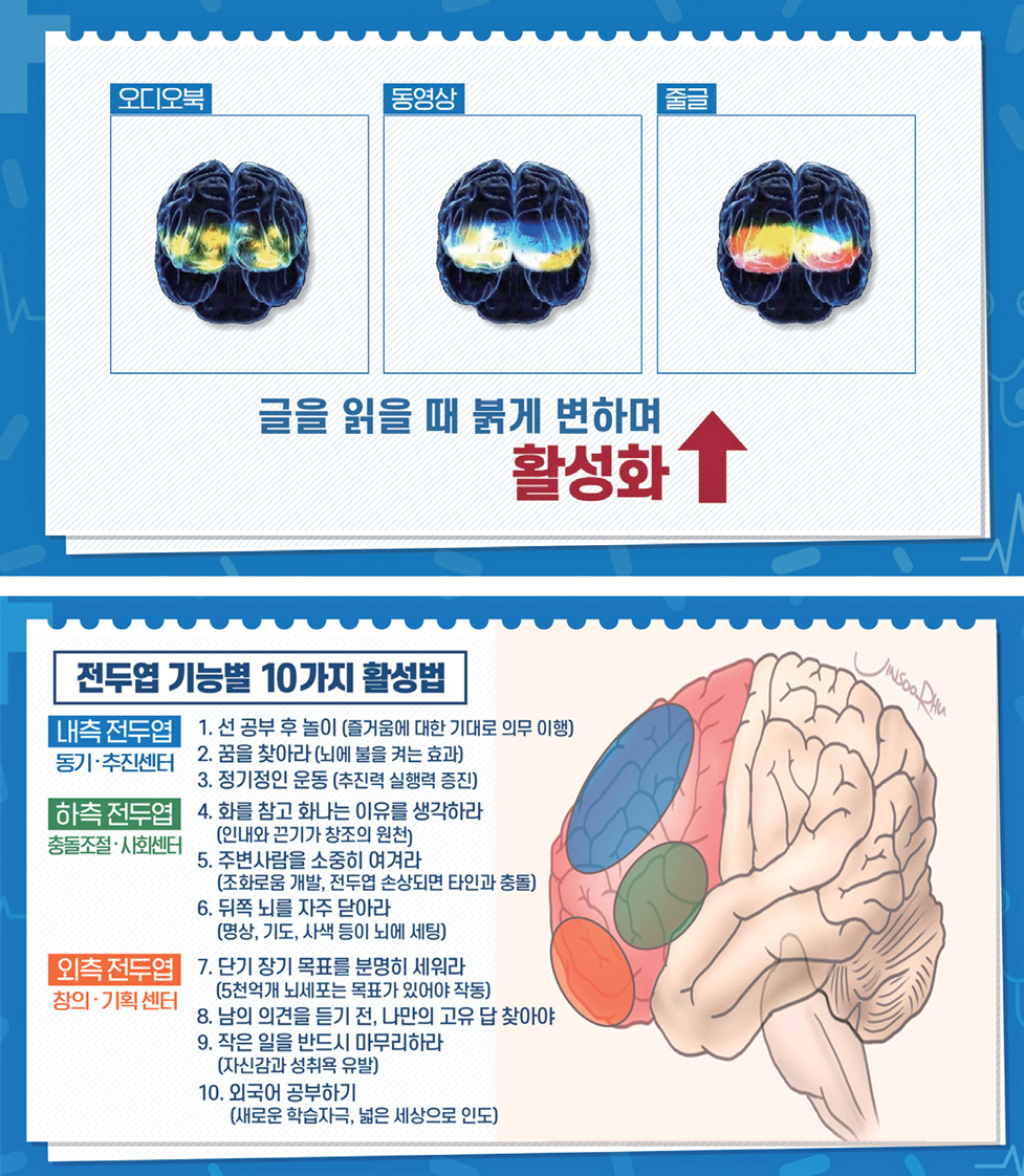 이 연결과 협일을 극대화하여 잠재 능력을 최대한 끌어내는 방법 중 하나가 바로 독서입니다. 상위 인지를 담당하며 오케스트라 지휘자 역할을 하는 전전두엽이 오디오북과 동영상을 볼 때는 크게 활성화되지 않았는데 종이책을 읽을 때는 크게 활성화되었다는 최신 연구 결과가 있어요. 독서는 전두엽을 필두로 뇌의 많은 영역을 동시에 활성화하는 데 큰 도움이 됩니다. 디지털 시대에도 읽기의 힘은 그 어떤 매체로도 대체할 수 없네요.