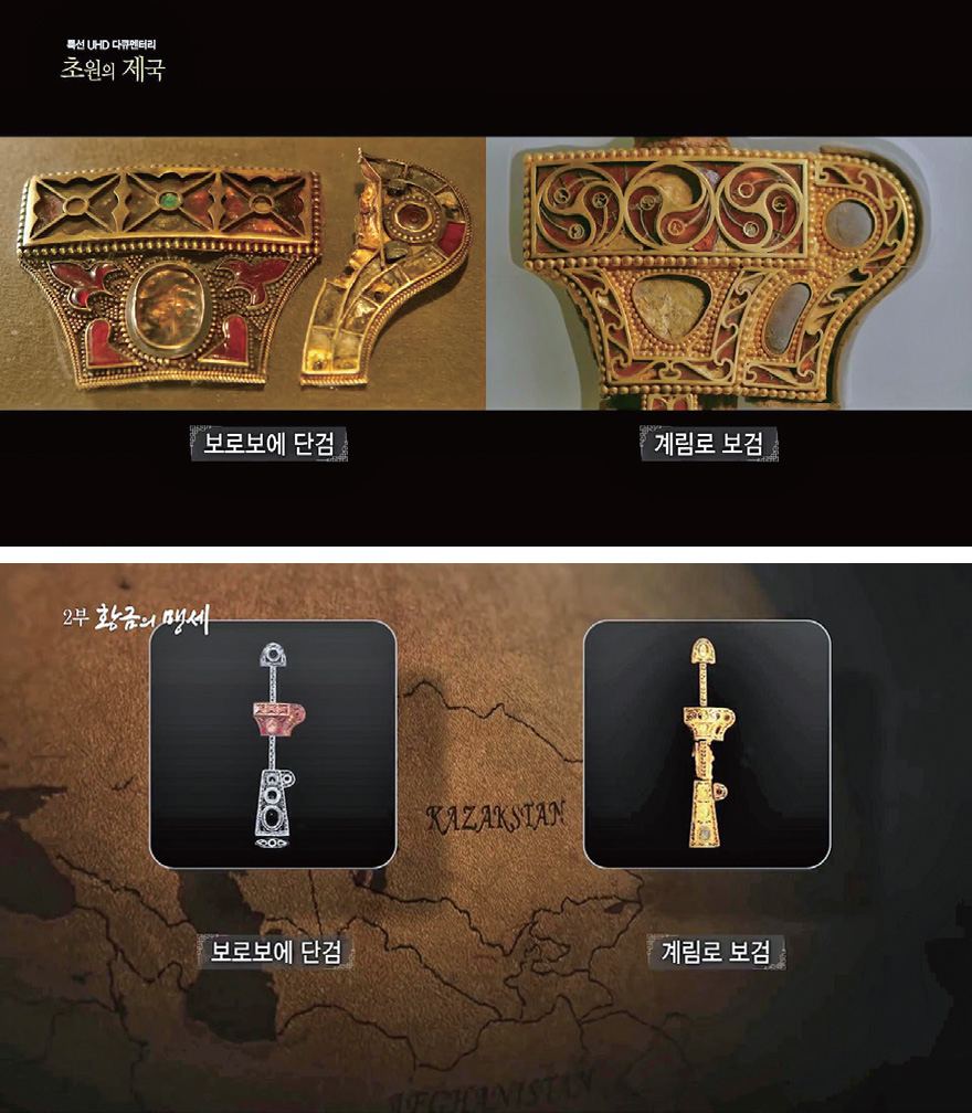 러시아의 예르미타시 박물관은 중앙유라시아 각지에서 출토된 황금 유물을 소장하고 있는 곳이다. 이곳에 전시된 세밀한 금구슬과 영롱한 붉은 석류석을 채워 넣은 문양의 이 황금 장식은 카자흐스탄 보로보에Borovoye에서 발굴됐는데 신라 황금보검黃金寶劍과 놀라울 만큼 유사하다. 신라 황금보검이 발굴되며 그보다 앞서 발굴된 이 황금 장식이 단검의 일부라는 게 밝혀졌을 정도다.