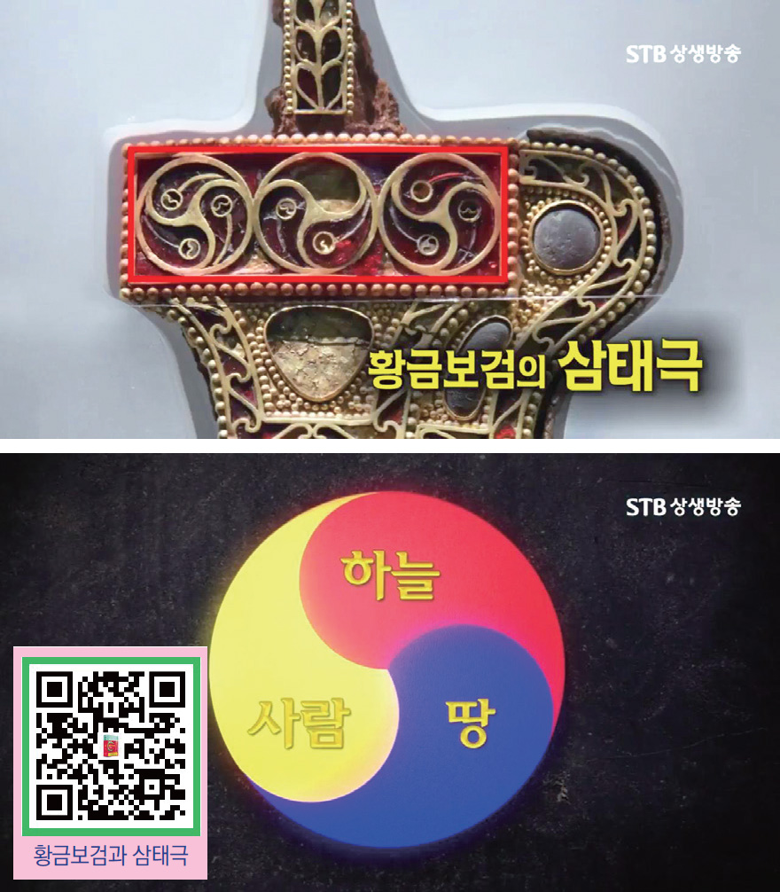 황금보검은 신라가 아니라 동로마 제국에서 제작되었다. 훈족을 연구한 이종호 박사(전 KIST 연구원)는 삼태극三太極이 새겨진 이 보검이 제작된 곳을 트라키아Thracia 지방이라고 단정한다. 경주에서 무려 8,000킬로미터나 떨어진 곳이다. 이종호 박사는 5세기 유럽이라면 훈족 왕 아틸라Attila가 패자로 군림하고 있었는데, 그렇다면 황금보검은 아틸라가 보내 준 선물이었을지 모른다고 그의 책 『황금보검의 비밀』에서 주장하고 있다. 그는 2003년 신동아에 〈고대 유럽 호령한 훈족 수장 아틸라는 한민족〉이라는 제목의 글까지 기고했다. 그 근거로 수많은 유물과 문화의 유사성을 제시한다. 또한 종도사님 말씀에서 살펴보면 이 황금보검의 삼태극 문양은 환국에서 전해진 천일天一(천광명), 지일地一(지광명), 태일太一(인광명)의 삼수 정신을 담고 있음을 확인할 수 있다.