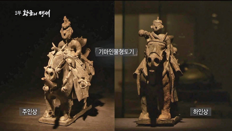 훈족이 발원한 시기에 유라시아 동쪽 끝에서 신라의 지배자로 등장한 김씨 성姓의 마립간麻立干들은 금관과 함께 또 한 가지 주목되는 유물을 남겼다. 금령총金鈴塚에서 발굴된 기마騎馬 인물형人物形 토기다. 말은 안장과 등자 그리고 등에는 동복을 갖추고 있다. 기마 인물형 토기는 주인상과 하인상 두 개가 함께 발견됐다. 하인은 오른손에 방울을 들었는데 저승까지 주인을 안내하는 것으로 보인다. 다큐는 이렇게 기마 인물형 토기에서도 주군과 친위 부대 코미타투스의 모습이 투영돼 있다고 한다.