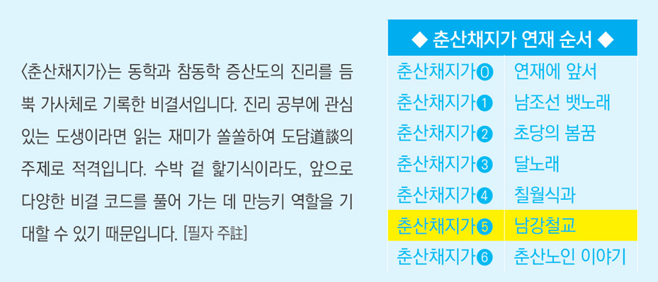 지금 지면에 보는 춘산채지가는 해방 후 증산도 2변 도운 부흥기에 팔교리八校理를 지낸 배동찬裵東燦(영주⋅봉화⋅문경 책임자) 선생이 그 지역에서 수집하여 교단에 올린 문서입니다. 세상에 유포된 다른 이본異本에는 경상도 놋다리라는 표현도 보입니다. 진주 남강이 경상도에 있는 것은 사실이고 놋다리가 경상도 세시 풍속인 것도 맞지만, 전라도 정읍에 본부를 두고 있던 보천교가 전라도 땅에 오신 상제님이 진주 강씨라는 포교 책자에 경상도를 강조할 개연성은 많지 않다고 봅니다.