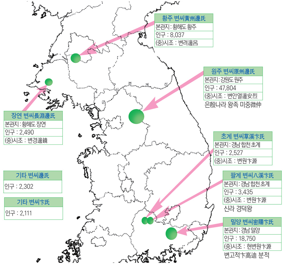 우리나라 변씨는 2015년 통계청 자료에 의하면 가장자리 변邊 자를 쓰는 변씨는 원주 변씨原州邊氏 47,804명, 장연 변씨長淵邊氏 2,490명, 황주 변씨黃州邊氏 8,037명, 기타 변씨邊氏 2,302명으로 총 60,633명으로 조사되었다.