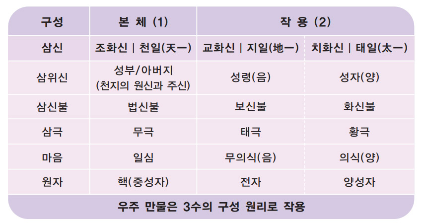 그것은 세 분의 신이 독립적으로 존재한다는 의미가 아니다. #신은 본래 일신一神이지만, 한 하나님이 하나 속에 셋이 깃들어 있는 3수의 신성과 주재 원리(즉일즉삼卽一卽三)로 만유를 창조, 섭리하신다는 뜻#이다. 즉 ‘일즉삼一卽三 삼즉일三卽一’의 논리로 하나 속에는 셋이 전제되어 있다. 본체 1은 본중말本中末의 변화 논리 때문에 반드시 3으로 작용한다.